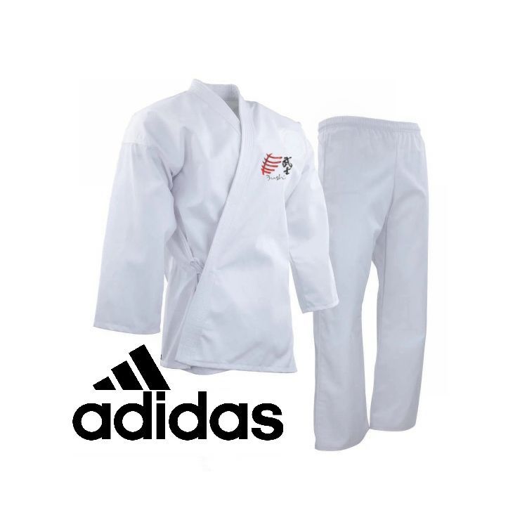 Adidas karate gi "Club" lavet af 60% bomuld og 40% polyester med en stofvægt på 210 g/m² (ca. 8 OZ)Bestående af jakke med mesh i ryggen, bukser med elastisk linning & snørre.